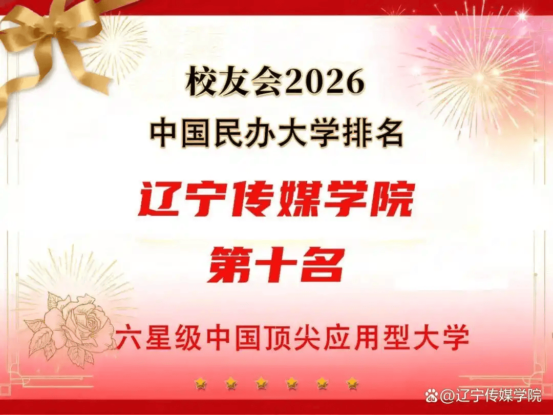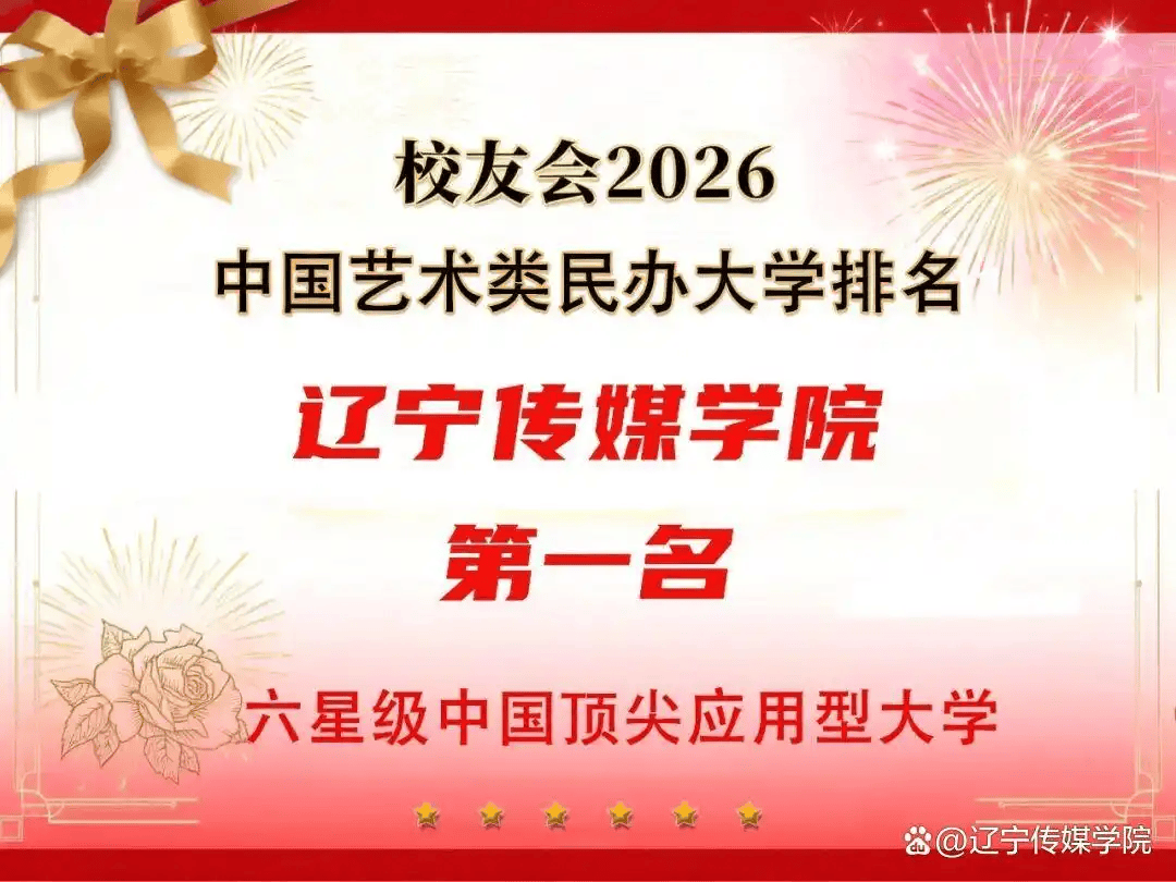1月12日,全国权威大学评价研究机构校友会正式发布2026中国大学排名,辽宁传媒学院凭借卓越的办学实力和鲜明的办学特色,位列中国民办大学(Ⅲ类)第十名, 中国艺术类民办大学第一名,获评“六星级中国顶尖应用型大学”美誉。