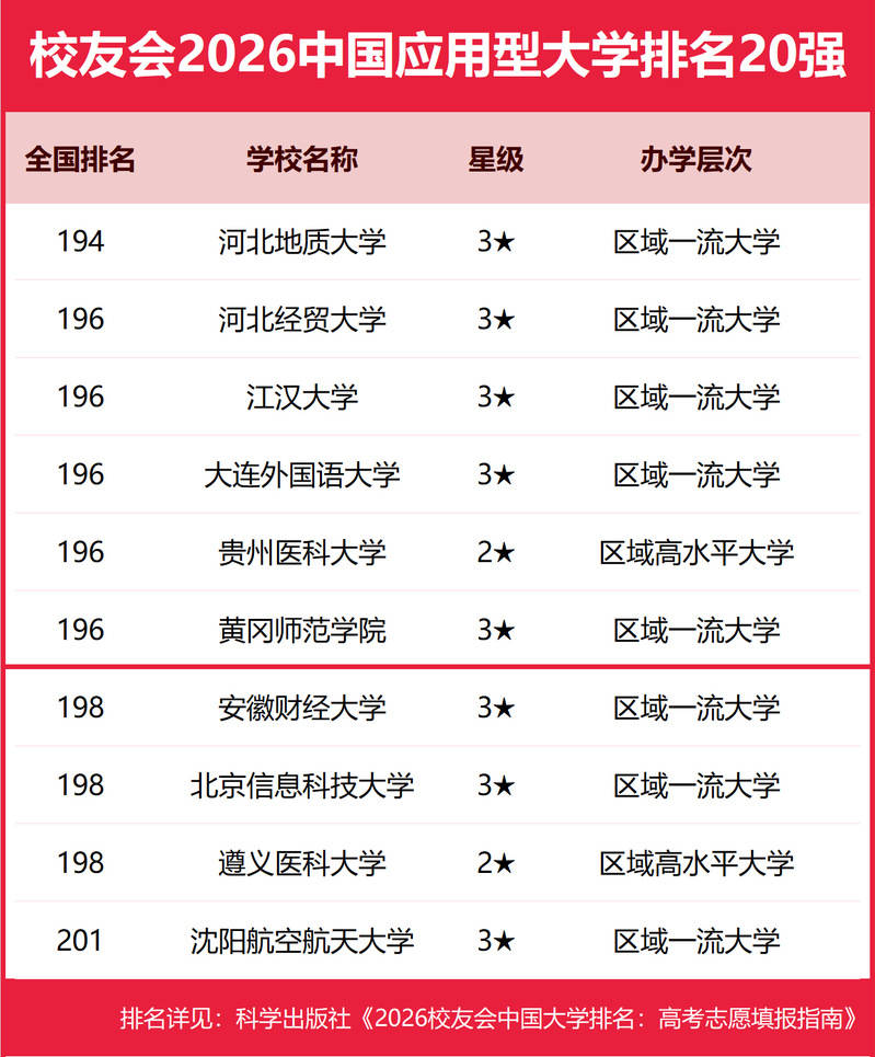 2026年1月12日,全国第三方大学评价研究机构艾瑞深校友会网(Cuaa.net)正式发布校友会2026中国大学排名,我校排名196位,较上一年度上升13位,并保持连续多年持续进位势头,直至今年首次进入中国大学排行榜前200强和应用型大学排名20强。