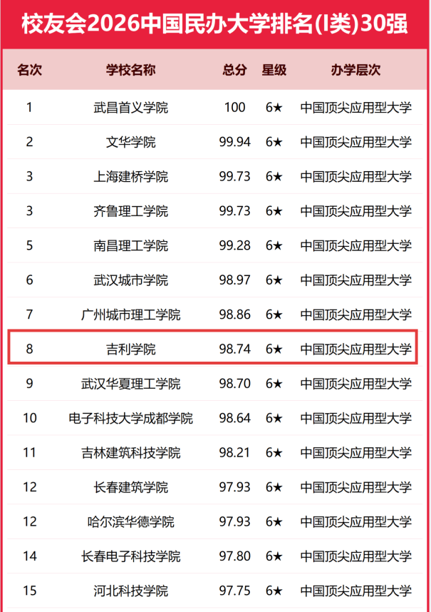 重磅揭晓!吉利学院稳居2026校友会中国民办大学(I类)全国八强!