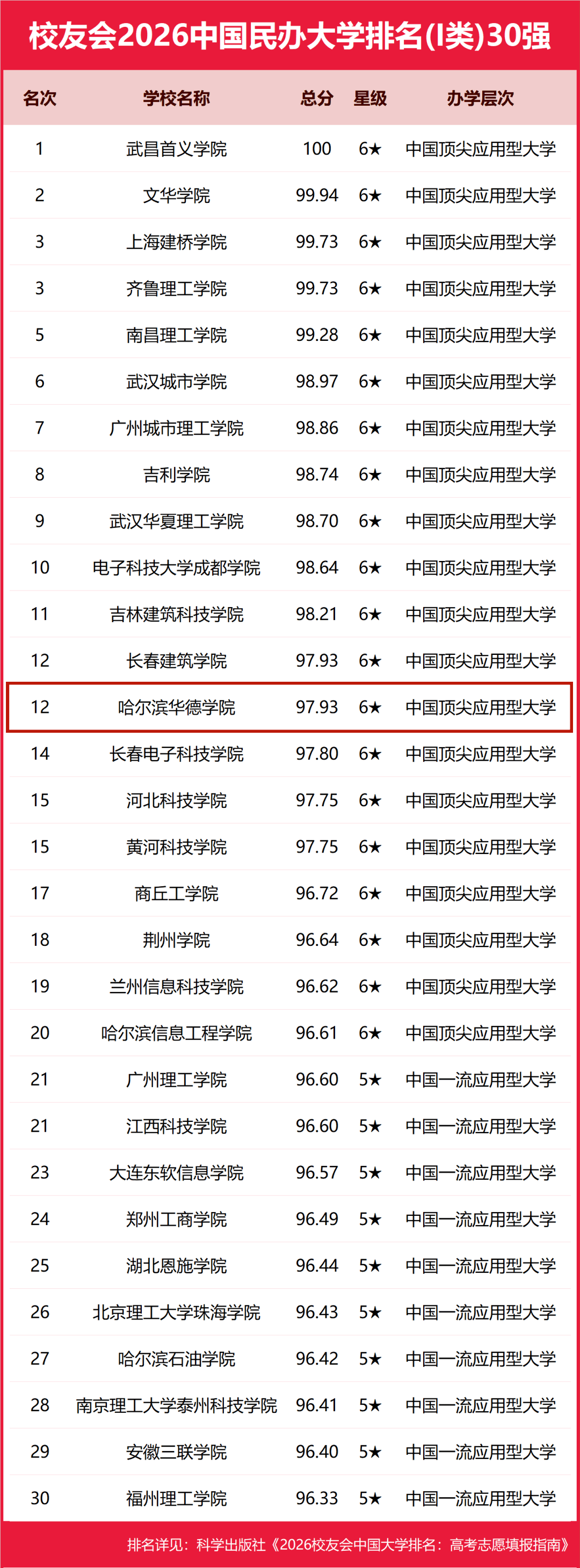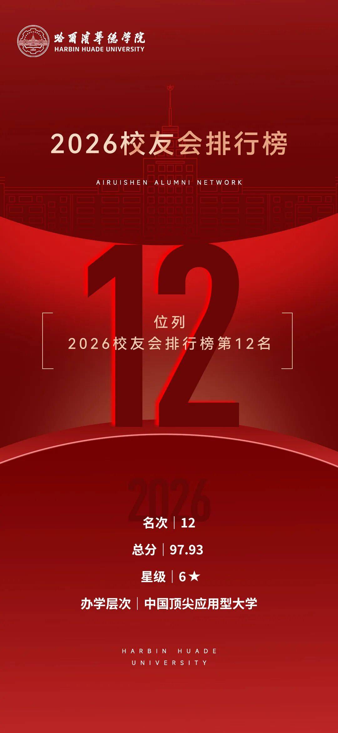 2026年1月12日,全国第三方大学评价研究机构艾瑞深校友会网(Cuaa.net)正式发布校友会2026中国大学排名。哈尔滨华德学院凭借卓越的办学实力和影响力,以总分97.93的优异成绩,荣登2026校友会排名第12名,获评中国顶尖应用型大学(6),省内同类院校工科类排名第一。在本次排名中,学校不仅较上一年度跃升一名,更实现了连续六年稳居“校友会中国民办大学排名20强(I类)” 的里程碑式成就。这一喜人成绩,标志着学校综合办学实力再上新台阶!