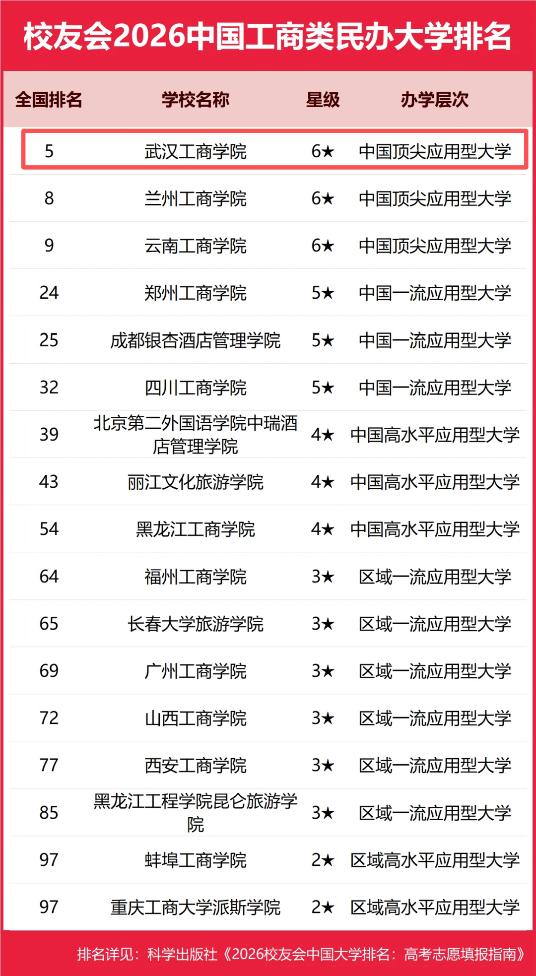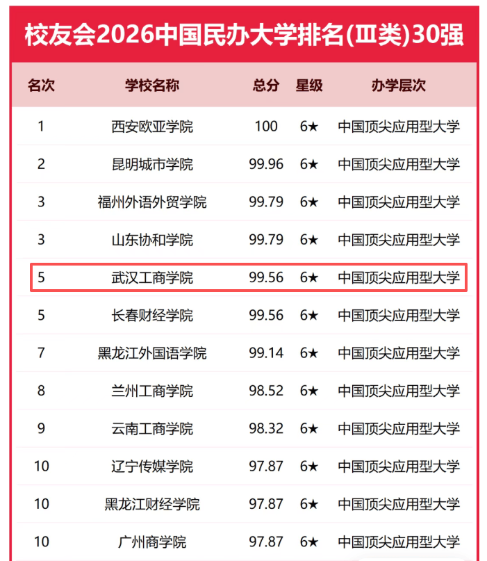 1月12日,艾瑞深校友会网正式发布校友会2026中国大学排名。榜单显示,武汉工商学院在中国工商类民办大学中办学实力最强、办学水平最高、最具竞争力,雄居榜首,这是学校连续第五年登顶该排行榜。