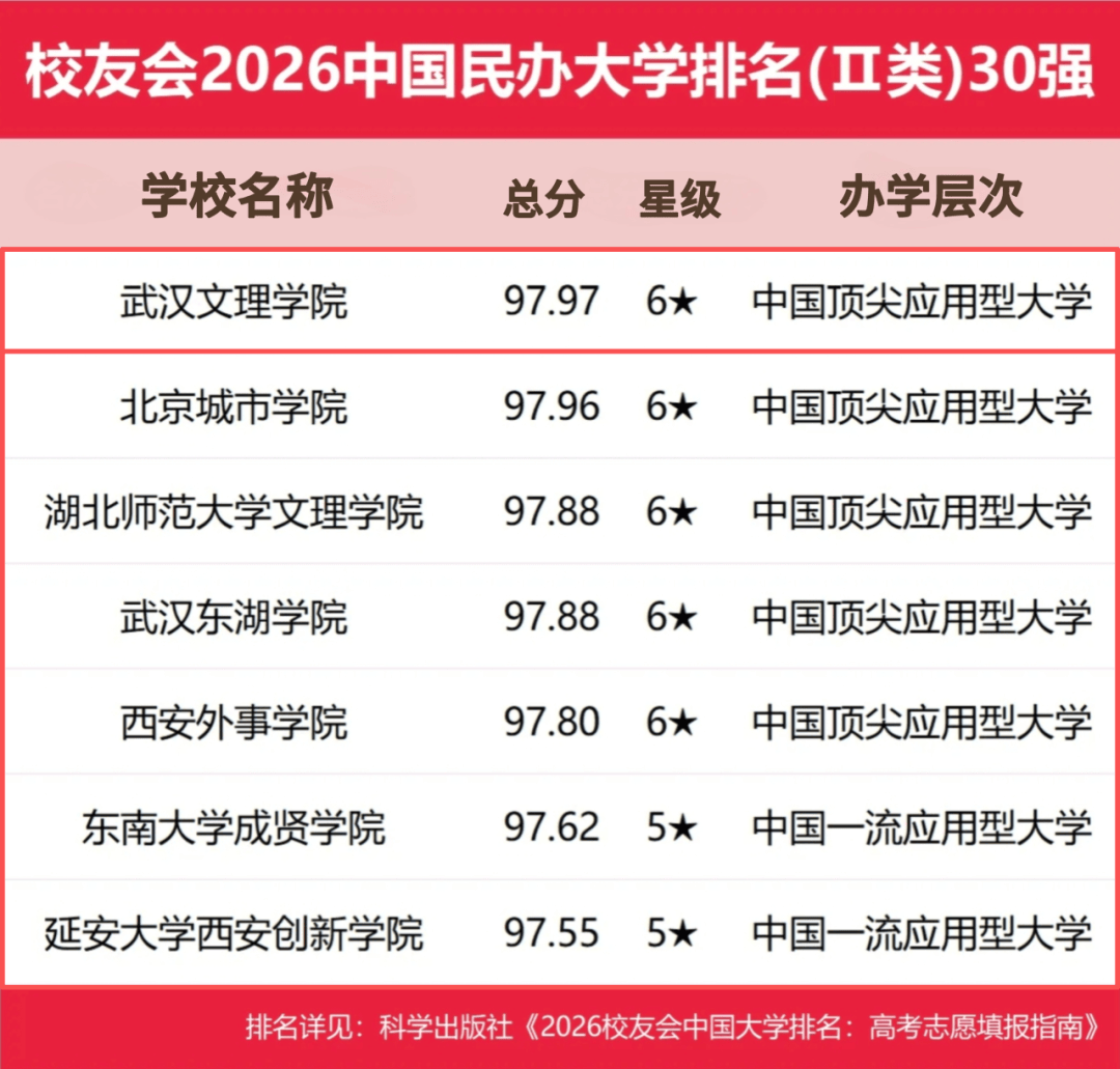 1月12日,《2026校友会中国大学排名:高考志愿填报指南》正式发布,在校友会2026中国民办大学排名(Ⅱ类)30强榜单,武汉文理学院实力跃升、排名前列,其办学层次被认定为6星级“中国顶尖应用型大学”。