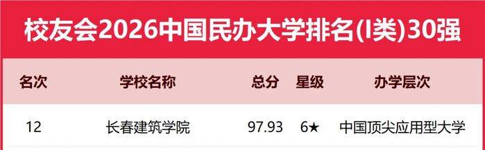 长春建筑学院荣居校友会2026中国民办大学排名(I类)第12名、全国前30强