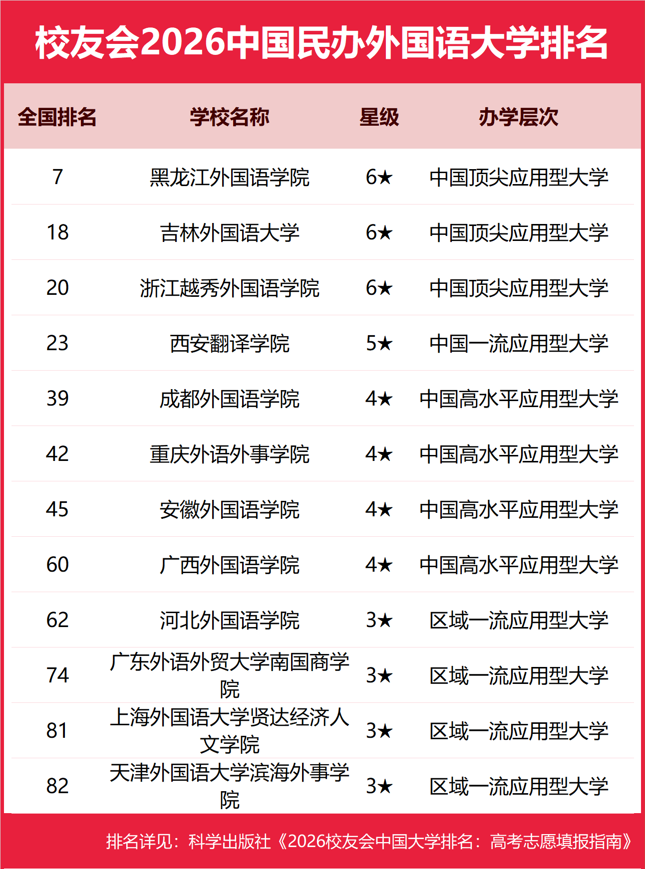 校友会2026中国外国语大学排名,北京外国语大学、黑龙江外国语学院、武汉外语外事职业学院第一