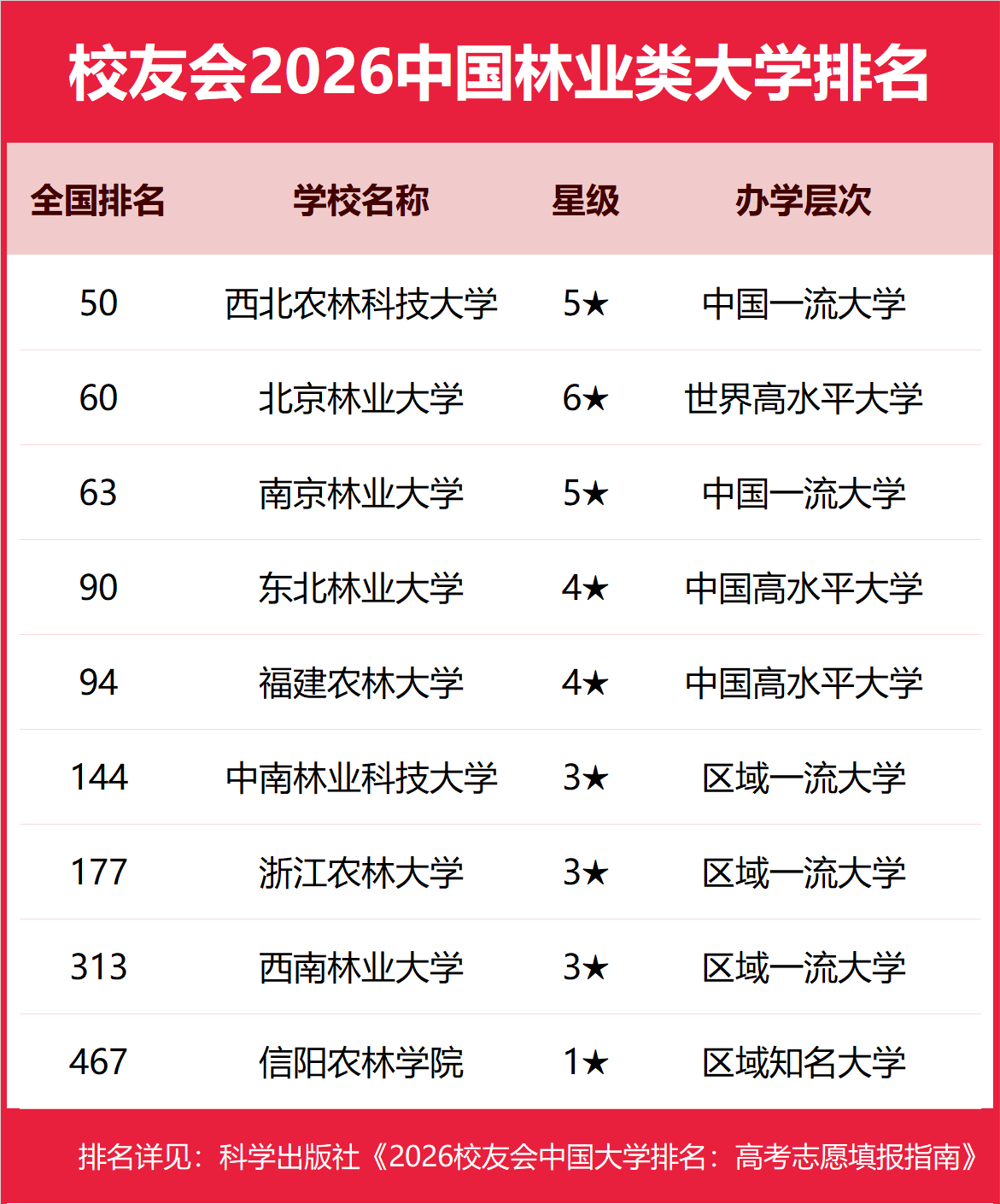 在最新校友会2026中国大学排名中,西北农林科技大学全国排名第50名,雄居2026中国林业类大学排名第一。北京林业大学第2,南京林业大学第3。名列前10强的其他高校为东北林业大学、福建农林大学、中南林业科技大学、浙江农林大学、西南林业大学、信阳农林学院。