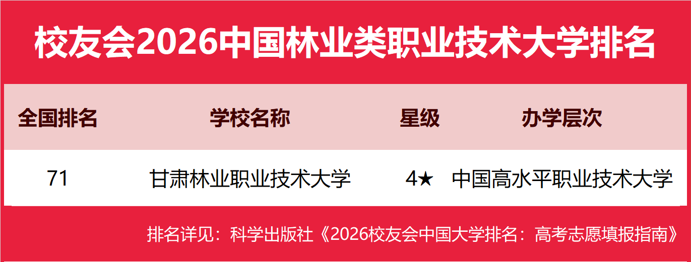 在校友会2026中国职业技术大学排名中,甘肃林业职业技术大学全国排名第71名。