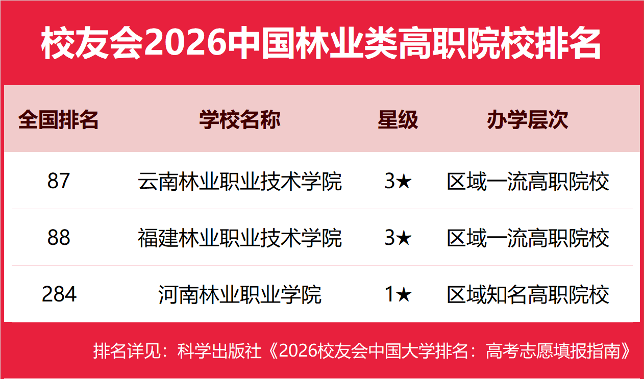 云南林业职业技术学院雄居2026中国林业类高职院校排名第一,河南林业职业学院跻身前3强