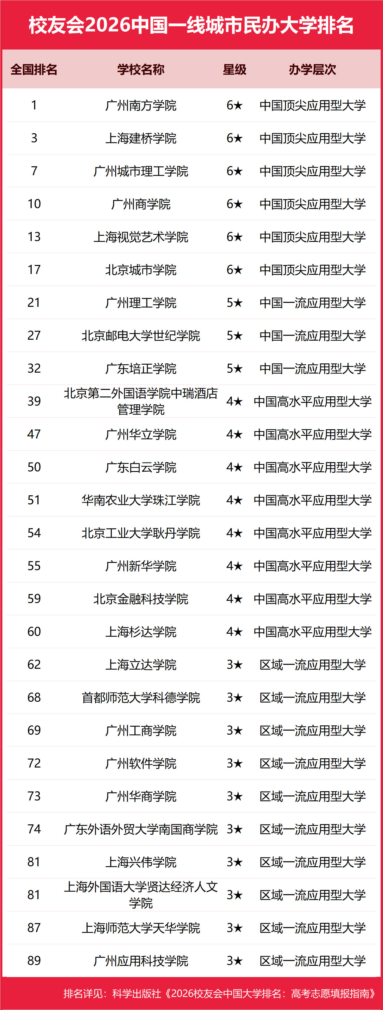 在校友会2026中国民办大学排名中,广州南方学院全国排名第1名,雄居2026中国一线城市民办大学排名第一。上海建桥学院第2,广州城市理工学院居第3。名列前10强的其他民办高校为广州商学院、上海视觉艺术学院、北京城市学院、广州理工学院、北京邮电大学世纪学院、广东培正学院、北京第二外国语学院中瑞酒店管理学院。