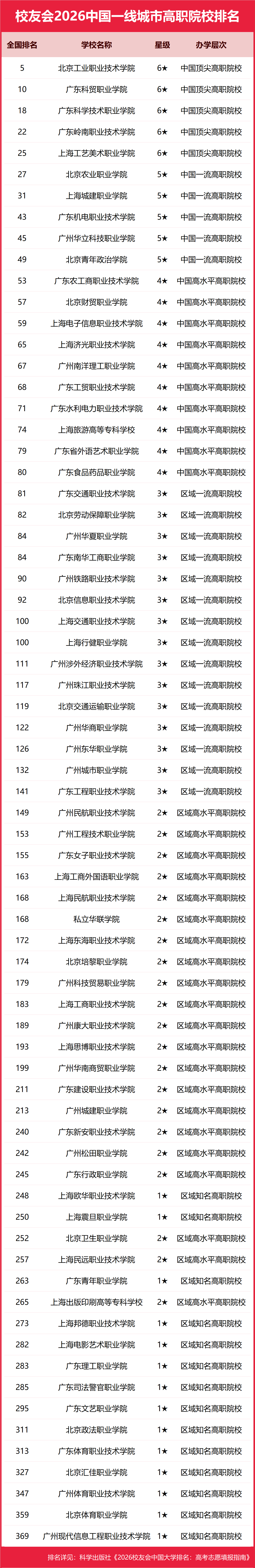 北京工业职业技术学院雄居2026中国一线城市高职院校排名第一,广东科学技术职业学院跻身前3强