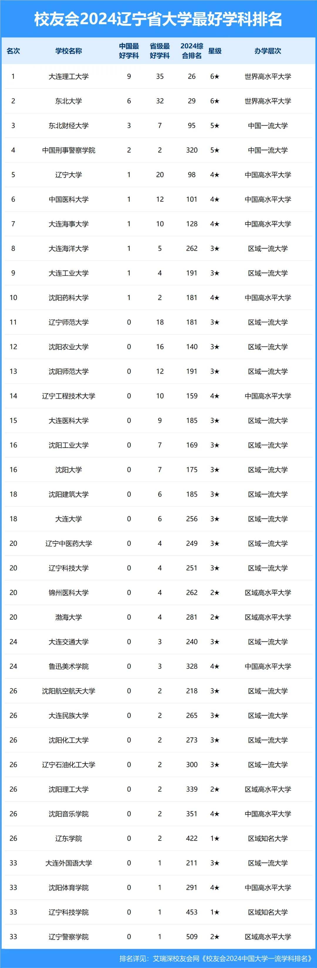 在校友会2024中国大学最好学科排名和2024辽宁省大学最好学科排名中,辽宁省共有大连理工大学、东北大学等10所高校的26个学科跻身2024中国最好学科名单,东北财经大学、中国刑事警察学院等36所高校的260个学科上榜2024辽宁省最好学科排名。