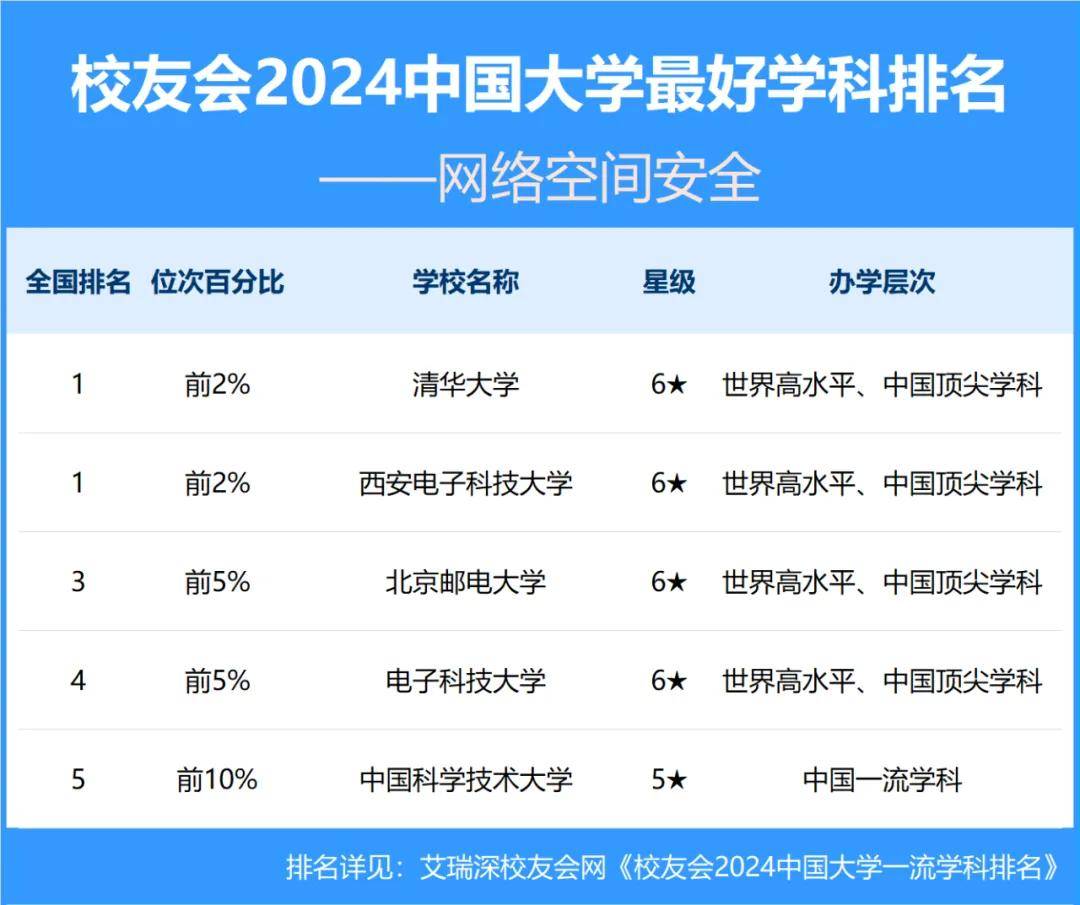 清华大学、西安电子科技大学位居校友会2024中国最好学科排名(网络空间安全)第一