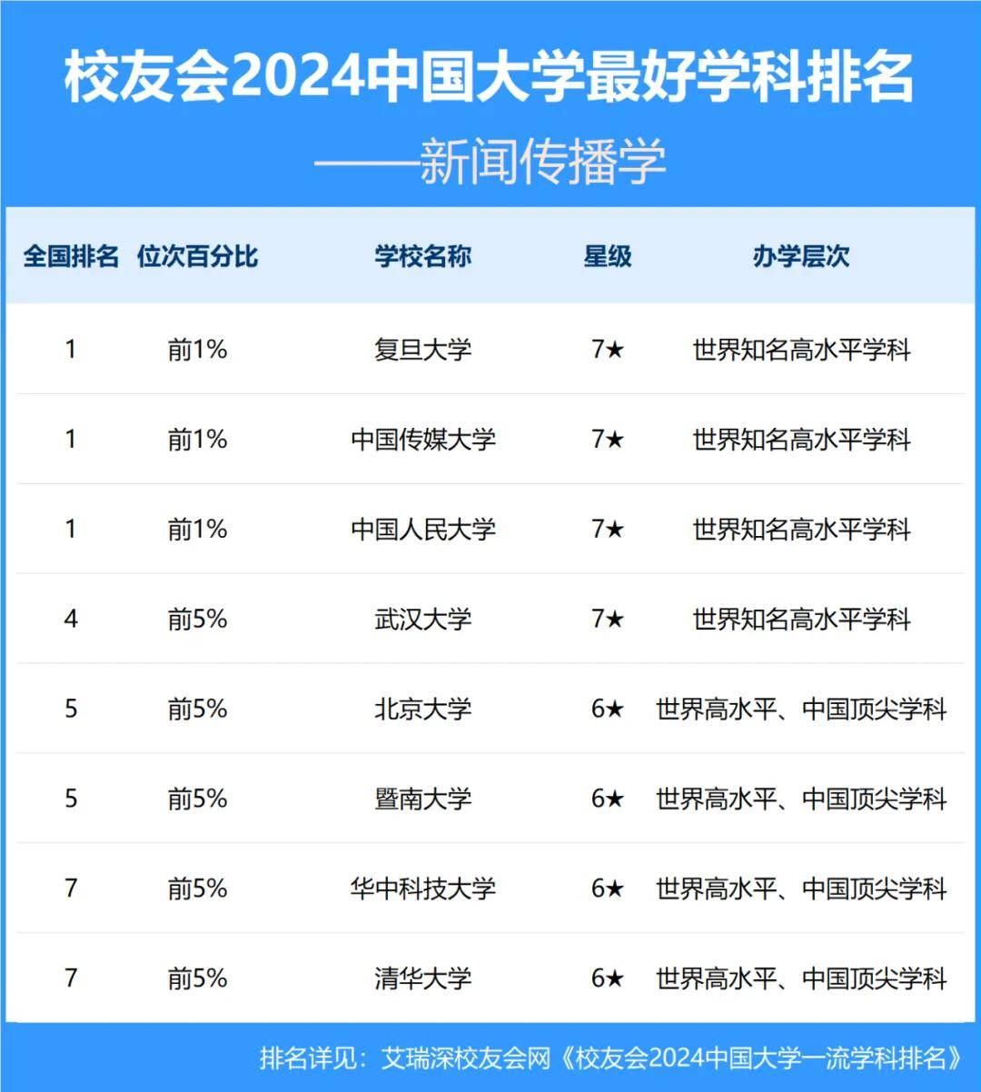 复旦大学、中国传媒大学、中国人民大学位居校友会2024中国最好学科排名(新闻传播学)第一