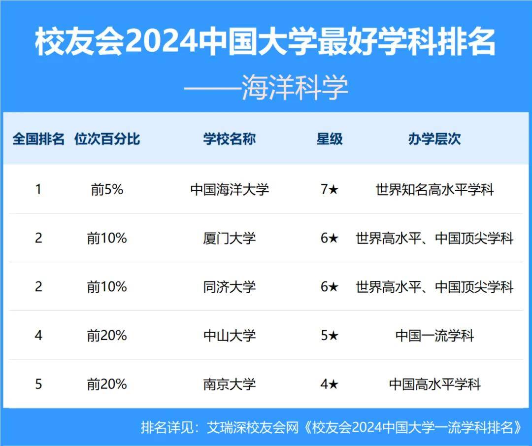 中国海洋大学位居校友会2024中国最好学科排名(海洋科学)第一