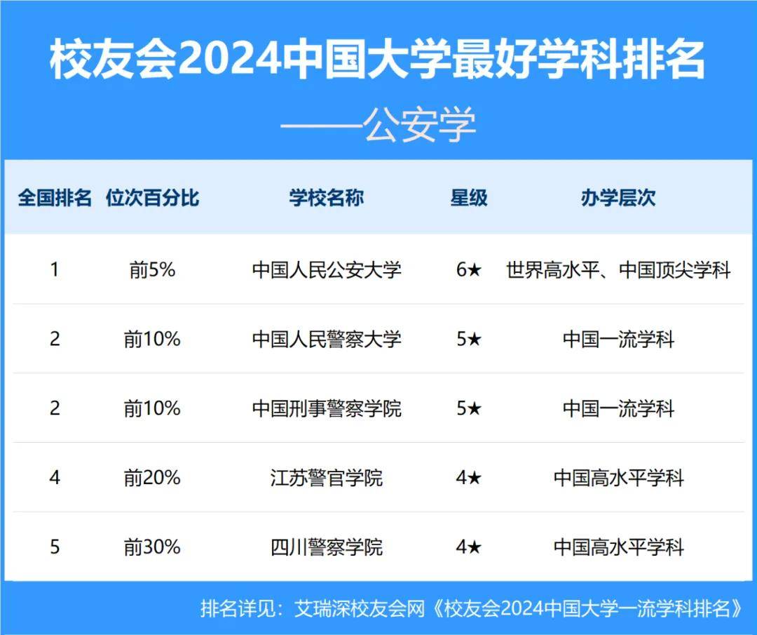 中国人民公安大学位居校友会2024中国最好学科排名(公安学)第一
