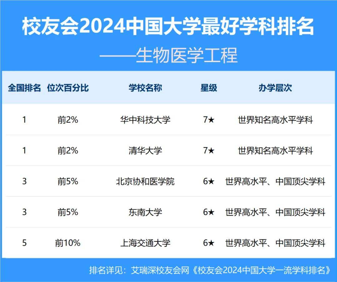 华中科技大学、清华大学位居校友会2024中国最好学科排名(生物医学工程)第一