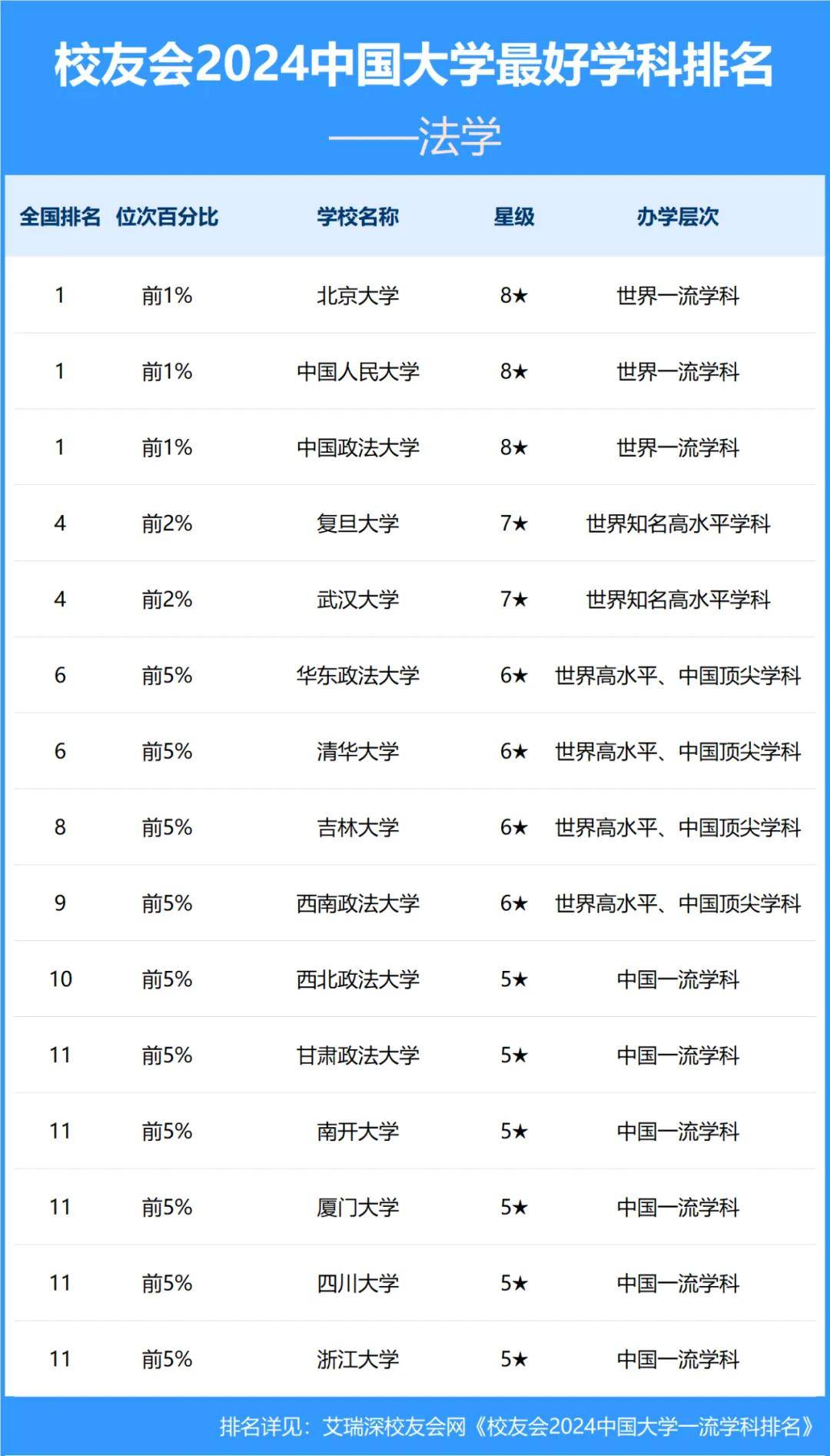 校友会2024中国大学法学最好学科排名,中国人民大学等排名第一