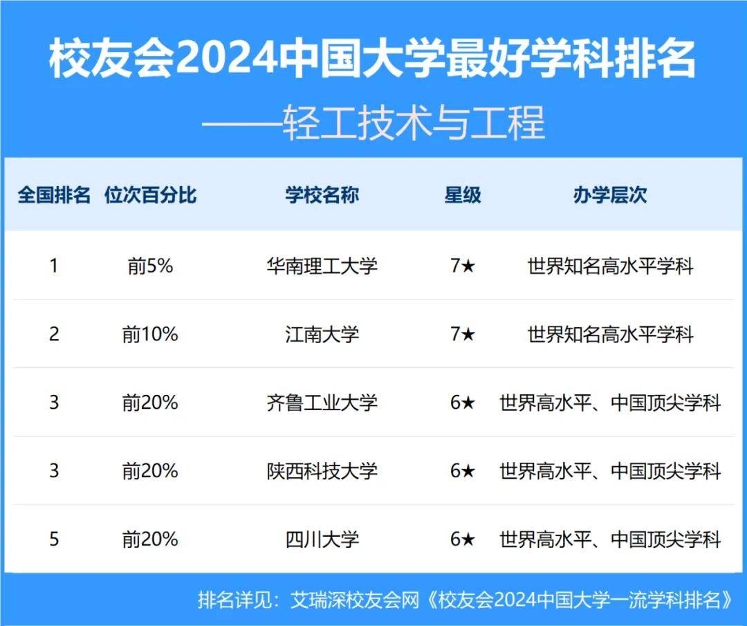 华南理工大学位居校友会2024中国最好学科排名(轻工技术与工程)第一