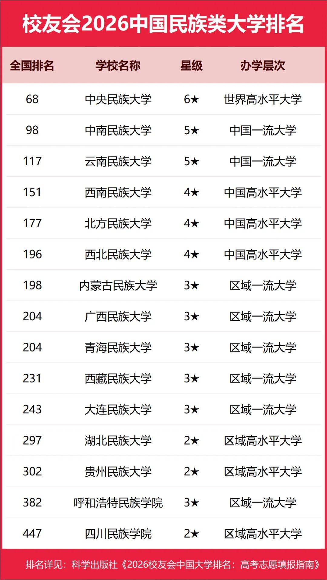 校友会2026中国民族类大学排名,中央民族大学、湖南民族职业学院第一