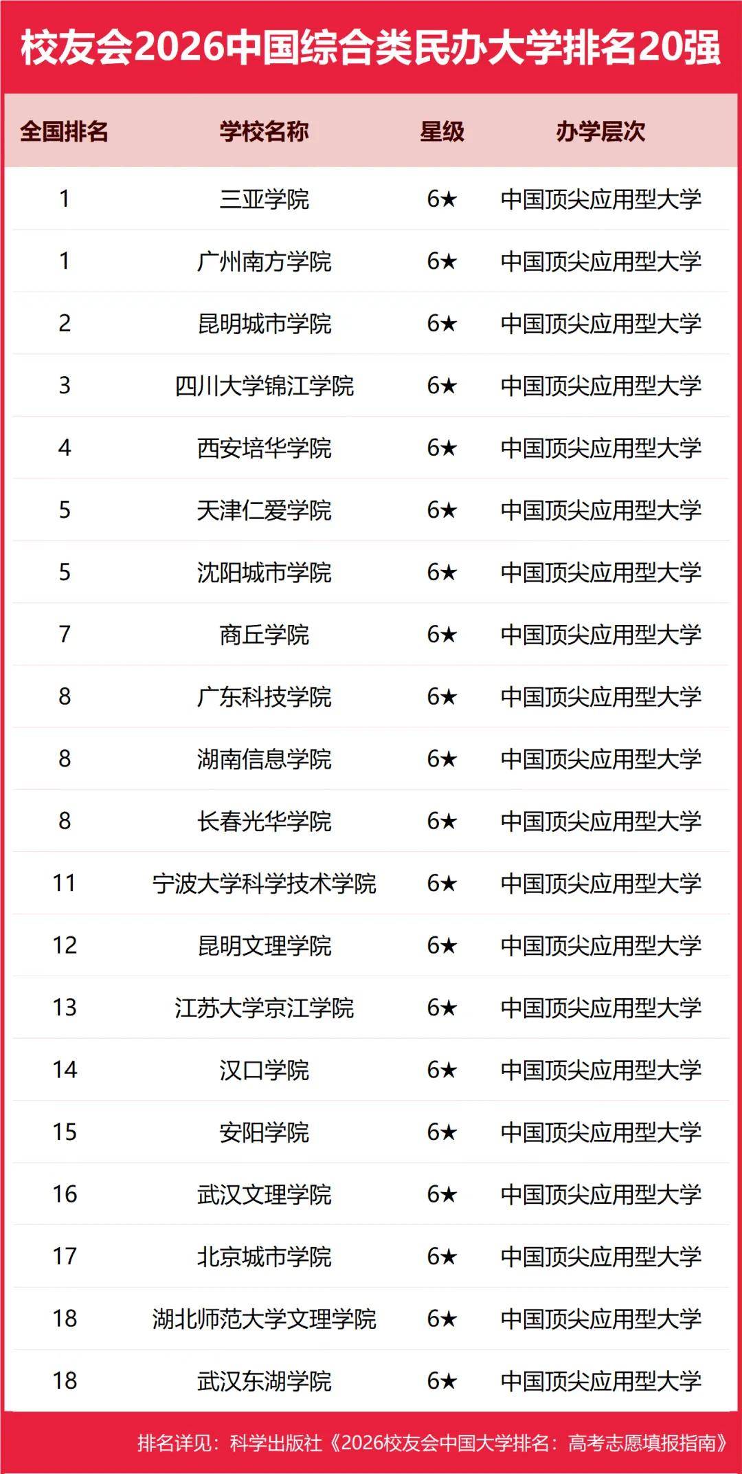 在校友会2026中国各类型民办大学排名中,武昌首义学院问鼎理工类民办大学排名第一,三亚学院、广州南方学院并列综合类民办大学排名第一,西安欧亚学院荣登财经类民办大学排名首位,山东协和学院稳居医药类民办大学排名榜首,辽宁传媒学院雄居艺术类民办大学排名第一,黑龙江外国语学院雄居语言类民办大学排名首位,南京师范大学泰州学院位列师范类民办大学排名榜首,华南农业大学珠江学院位列农林类民办大学排名第一,武汉体育学院体育科技学院雄居体育类民办大学排名第一。