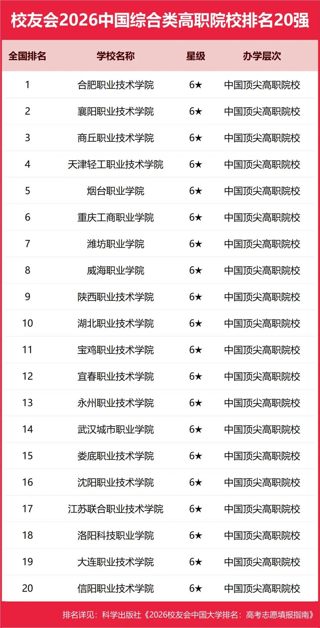 在校友会2026中国各类型高职院校排名中,江西应用技术职业学院问鼎理工类高职院校排名第一,合肥职业技术学院雄居综合类高职院校排名榜首,浙江金融职业学院荣登财经类高职院校排名首位,广东亚视演艺职业学院问鼎艺术类高职院校排名第一,山东医学高等专科学校稳居医药类高职院校排名第一,江苏农林职业技术学院雄居农林类高职院校排名第一,郑州体育职业学院雄居体育类高职院校排名第一,铜仁幼儿师范高等专科学校雄居师范类高职院校排名第一,湖南民族职业学院雄居民族类高职院校排名第一,河北政法职业学院雄居政法类高职院校排名第一,武汉外语外事职业学院跃居语言类高职院校排名冠军。