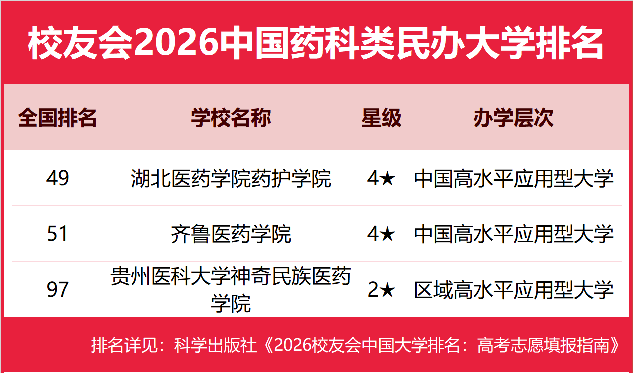 在校友会2026中国民办大学排名中,湖北医药学院药护学院全国排名第49名,雄居2026中国药科类民办大学排名第一。齐鲁医药学院第2,贵州医科大学神奇民族医药学院居第3。
