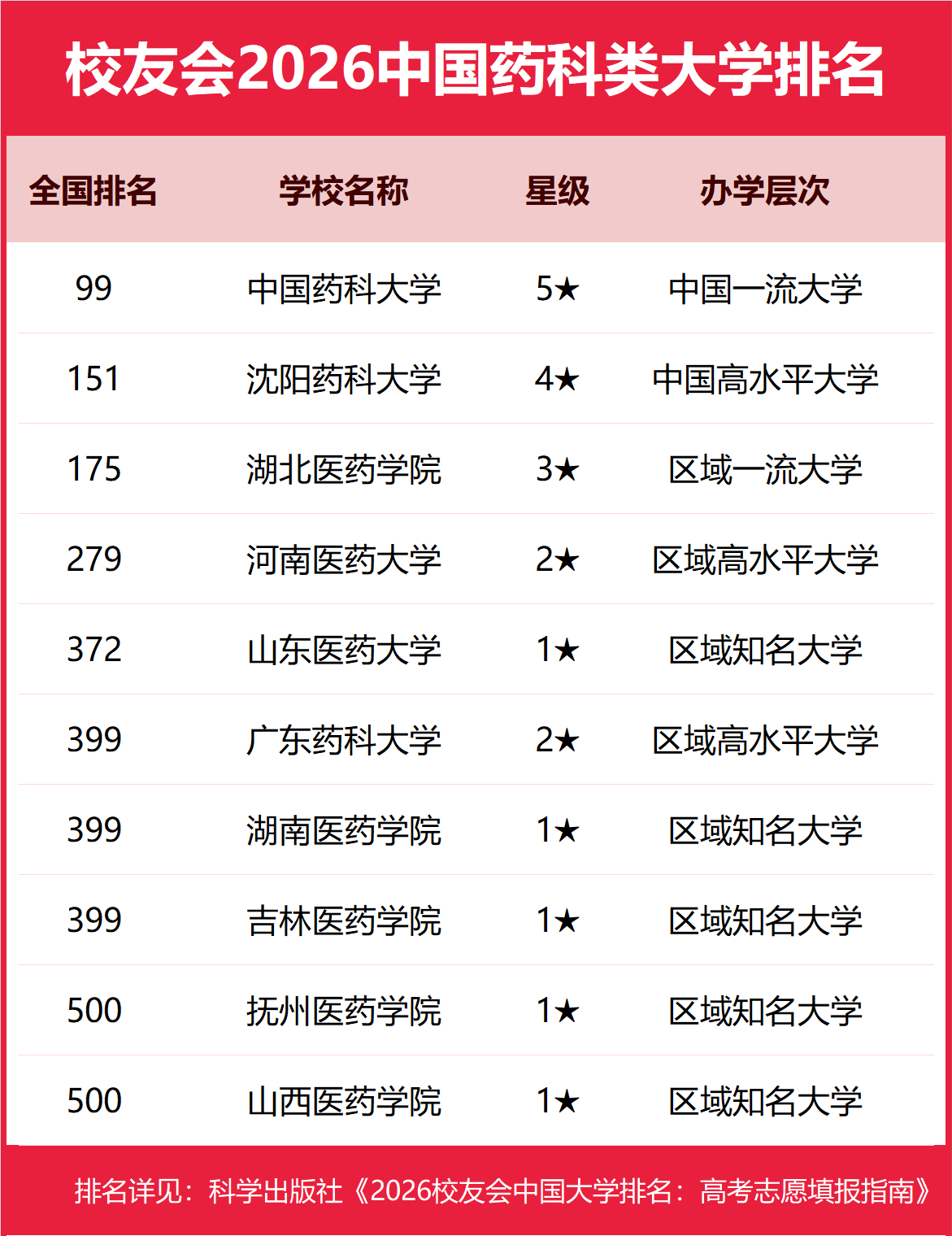 校友会2026中国药科类大学排名,中国药科大学、湖北医药学院药护学院、浙江药科职业大学、辽宁医药职业学院第一