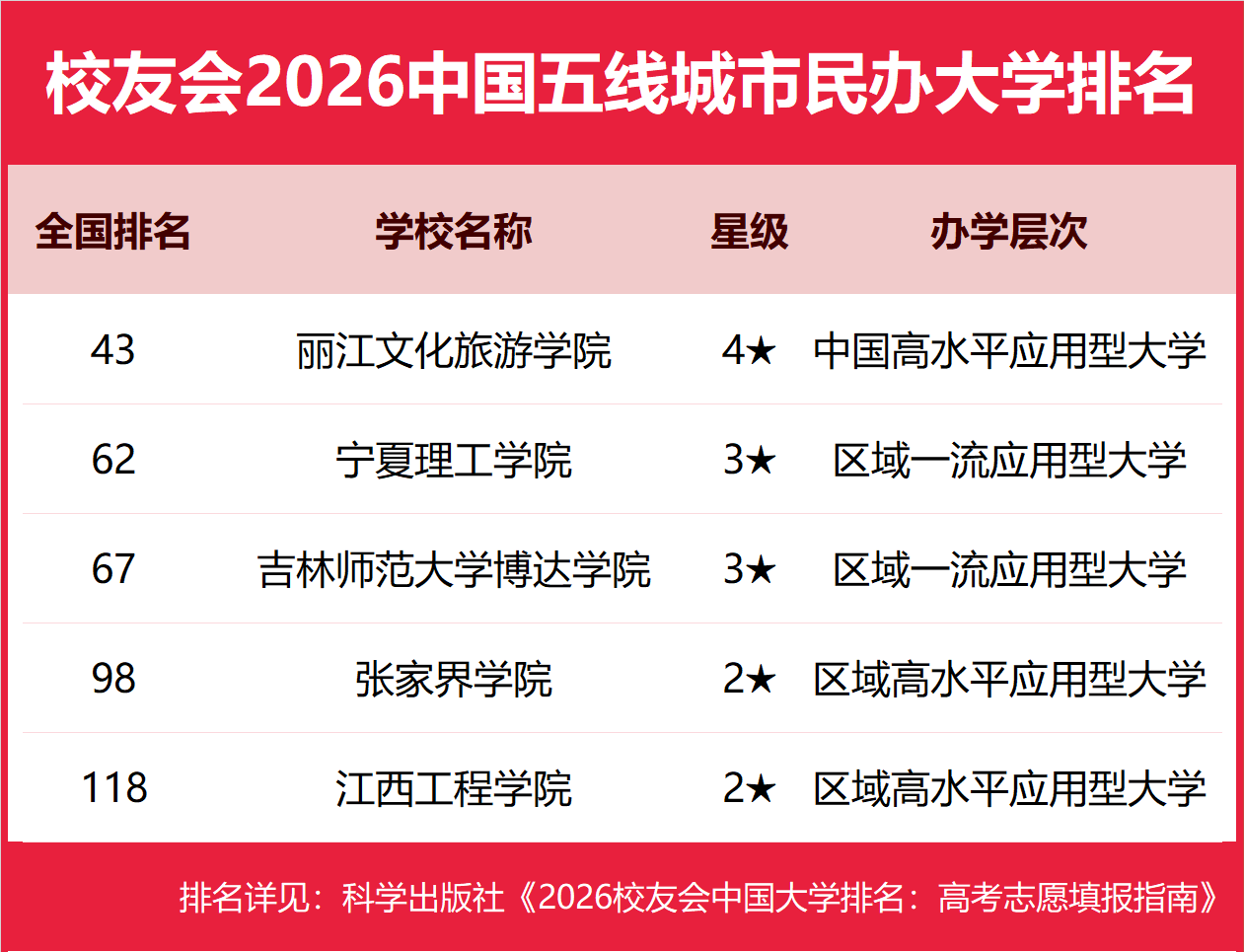 丽江文化旅游学院雄居2026中国五线城市民办大学排名第一,江西工程学院跻身前10强