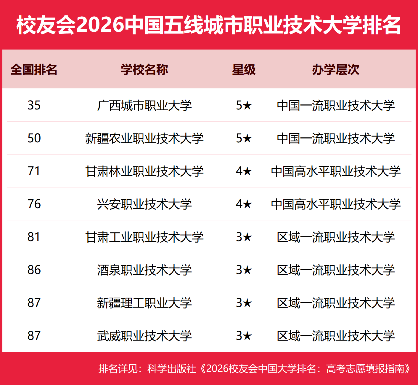 广西城市职业大学雄居2026中国五线城市职业技术大学排名第一,新疆农业职业技术大学跻身前3强